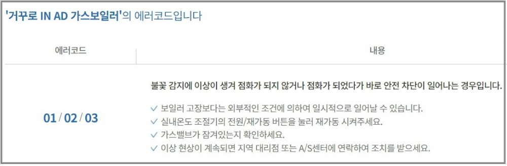 아래 화면은 '거꾸로 IN AD 가스보일러'의 에러코드에 대한 안내입니다. 보일러 이상현상에 대해 미리 알 수 있으니 꼭 자가진단 메뉴얼을 먼저 확인하시기 바랍니다.