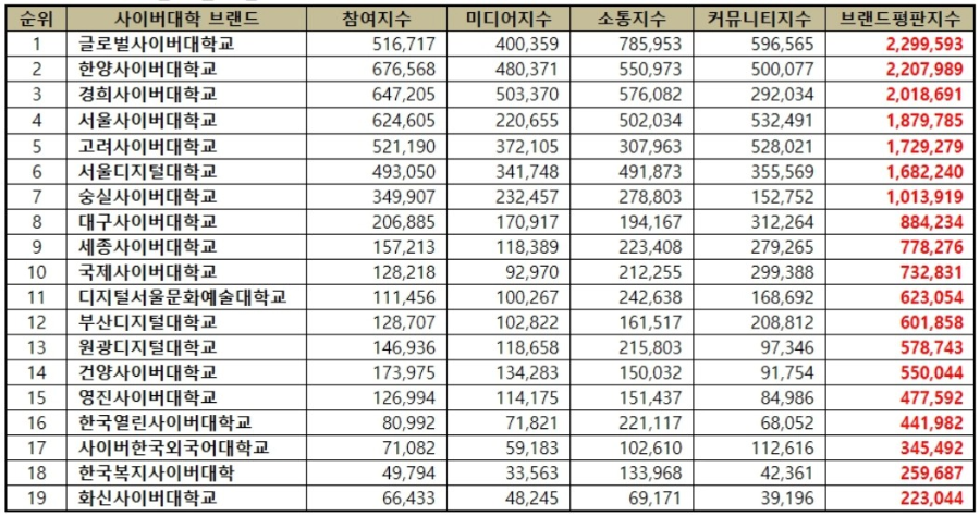 2025년 2월에는 글로벌사이버대학교가 사이버 대학 브랜드평판 1위를 차지하며 온라인 교육의 선두주자로 자리매김했으며, 한양사이버대학교와 경희사이버대학교가 그 뒤를 이으면서 각각 2위와 3위를 차지했습니다.