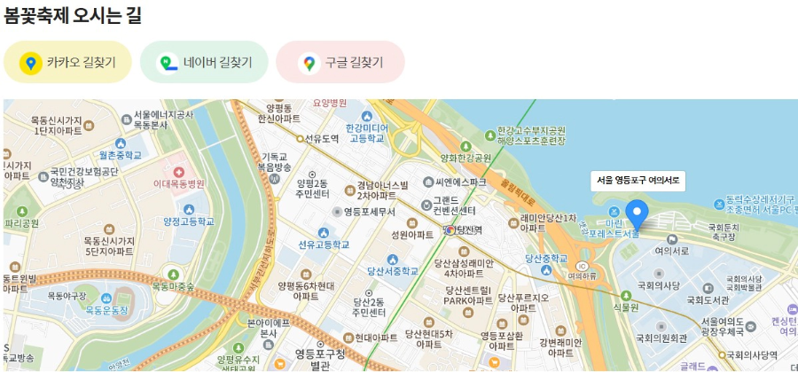 • 장소: 서울 영등포구 여의서로 벚꽃길(서강대교 남단 사거리 ↔ 의원회관 앞 교차로)