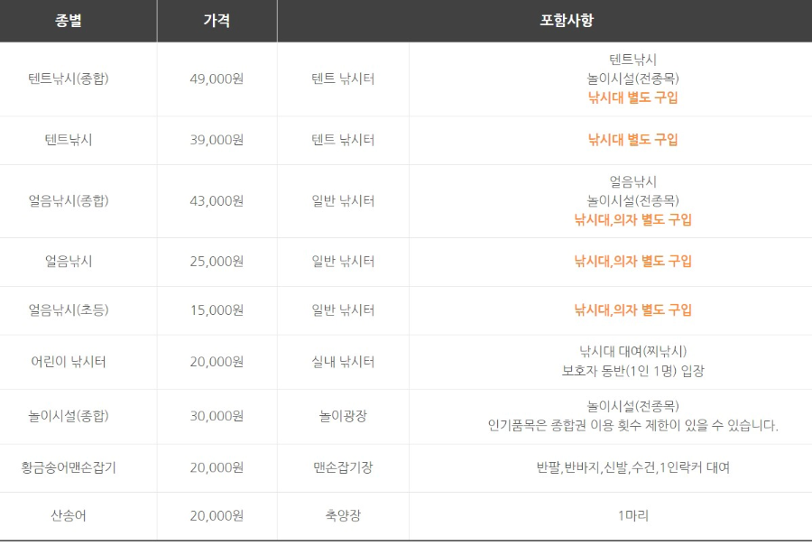조용히 낚시를 즐기고 싶으신가요? 텐트 안에서 편안하고 아늑하게 낚시를 즐길 수 있는 텐트낚시 프로그램은 특히 가족 단위 방문객들에게 인기가 많습니다. 텐트 낚시 가격은 아래표를 참고하세요.