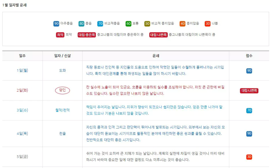월간 운세는 한 달 운세를 날짜별로 상당히 자세하게 알려주는데요,  아래 화면처럼 보기 쉽게 색깔과 점수별로 일자별 운세를 보여줍니다. 특히 조심해야 하는 날을 미리 알 수 있어서 혹시라도 큰 일을 도모해야 할 때 참고하면 도움이 될 듯하네요.