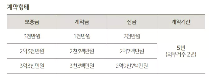 보증금은 3천만 원, 2억 3천만 원, 3억 3천만 원 세 가지 종류이고, 이 보증금 금액에 따라 매달 납부해야 하는 이용료(월세와 관리비)가 달라집니다.